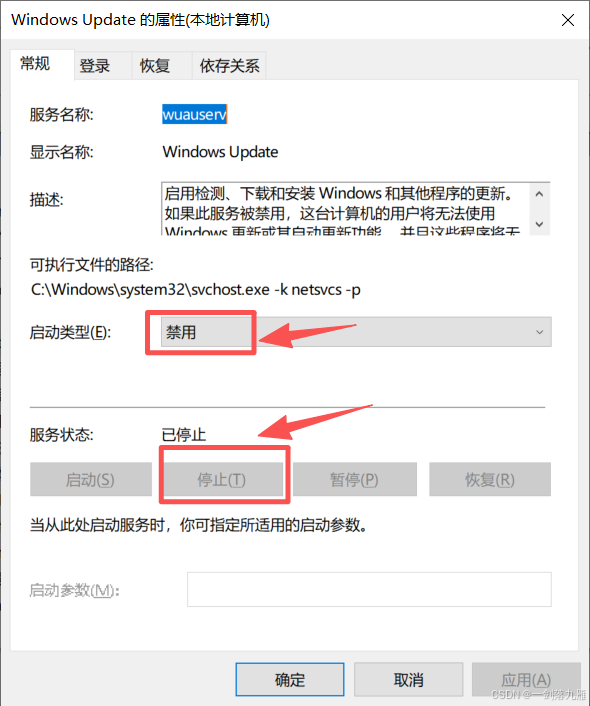2、禁用 Windows Update:找到"Windows Update",启动类型设为"禁用",并点击"停止"。