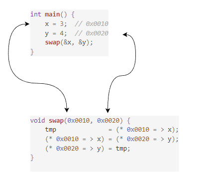 这里我们假设两个变量 x, y 的地址分别是 0x0010 和 0x0020 。然后调用 swap(*, *) 函数,并将地址传入,此时函数的两个参数记录着 0x0010 和0x0020 。然后在函数体内通过解引用运算符 * 获得 x, y 的实体,这样就能实现跨模块对我们希望操作的对象进行操作。