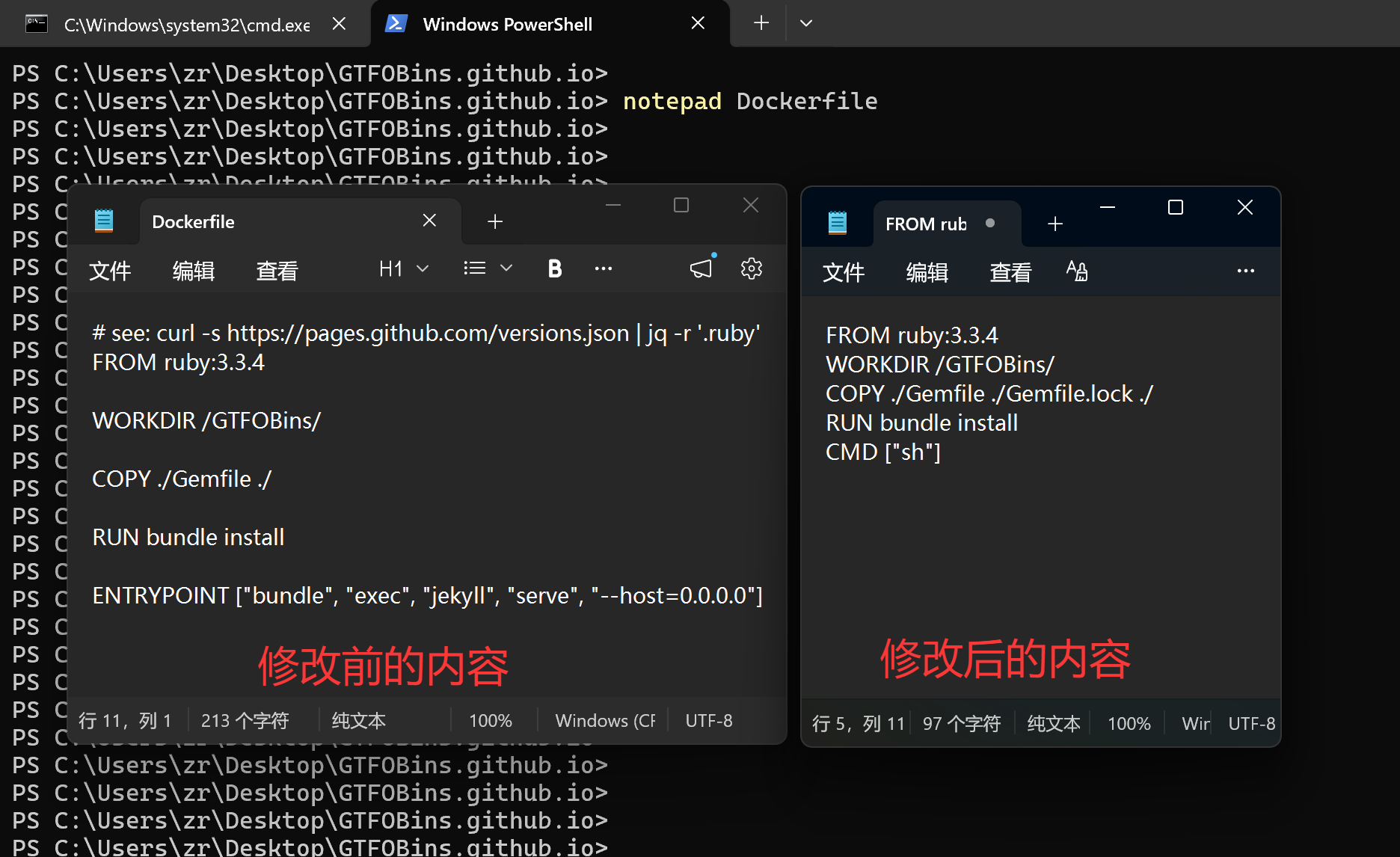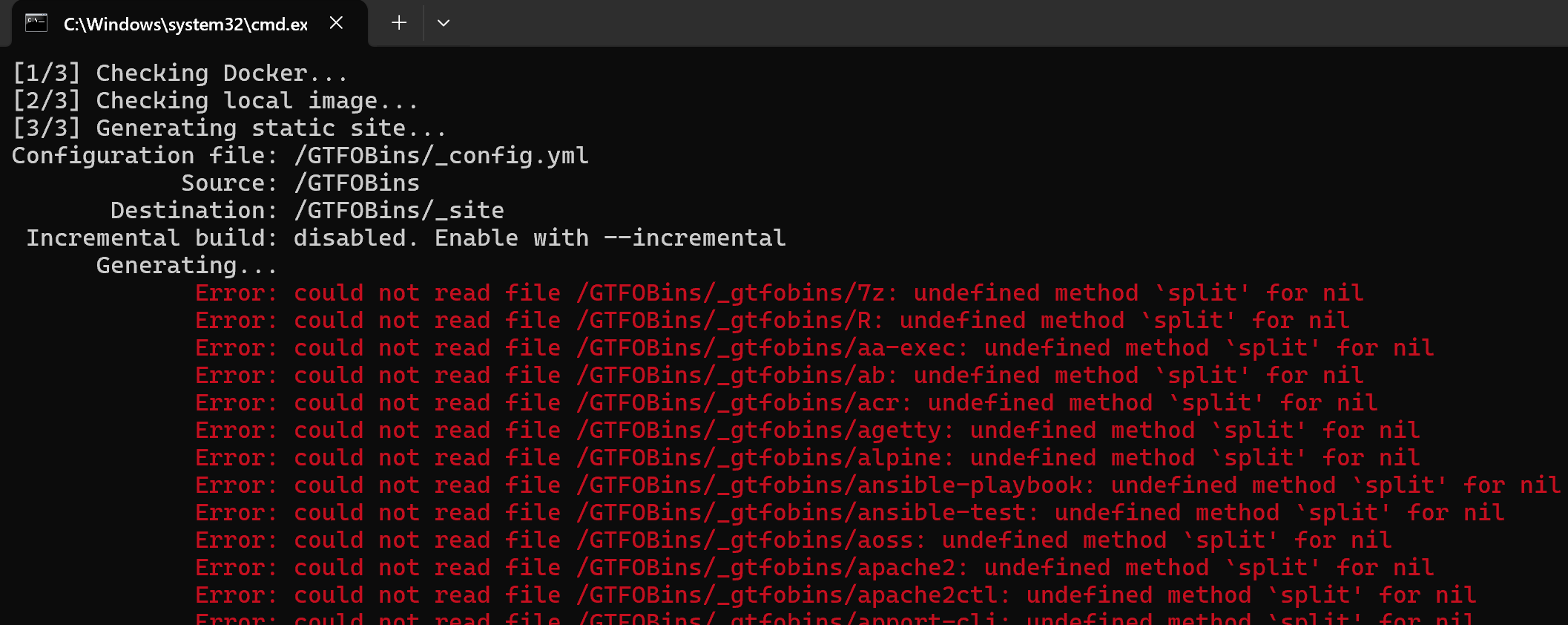 因为 GTFOBins 官方仓库本质上是一个基于 Jekyll 的静态站点,而 Jekyll 这一套在 Windows 原生环境里折腾起来通常比较麻烦。