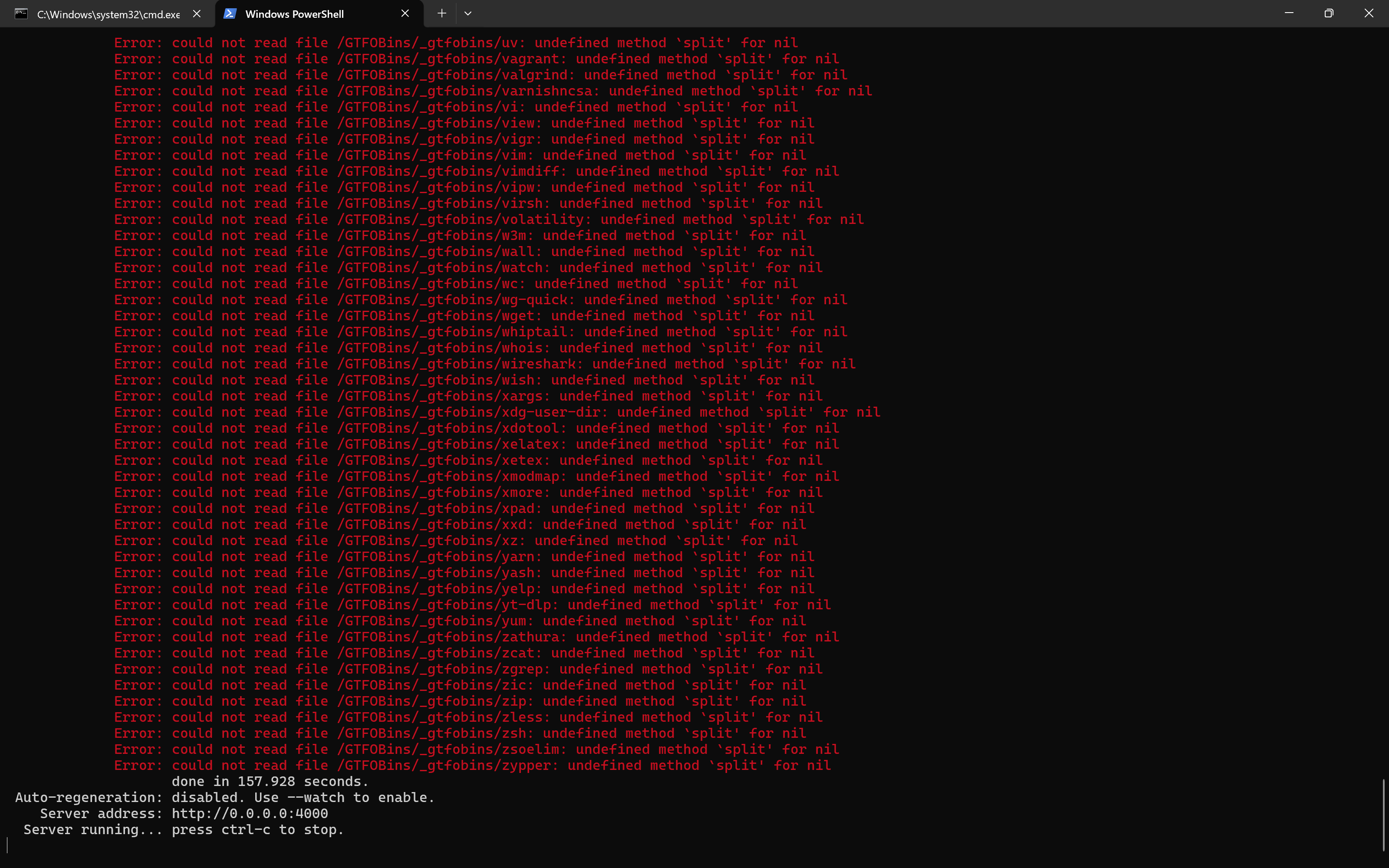 docker run --rm -it --entrypoint sh -p 4000:4000 -v "%cd%:/GTFOBins/" gtfobins-local -lc "bundle install && bundle exec jekyll serve --host=0.0.0.0 --no-watch"