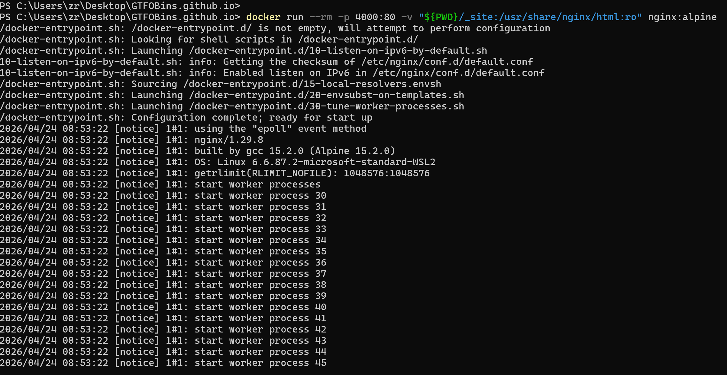 docker run -d --name gtfobins-site -p 4000:80 -v "%cd%\_site:/usr/share/nginx/html:ro" nginx:alpine >nul