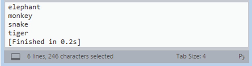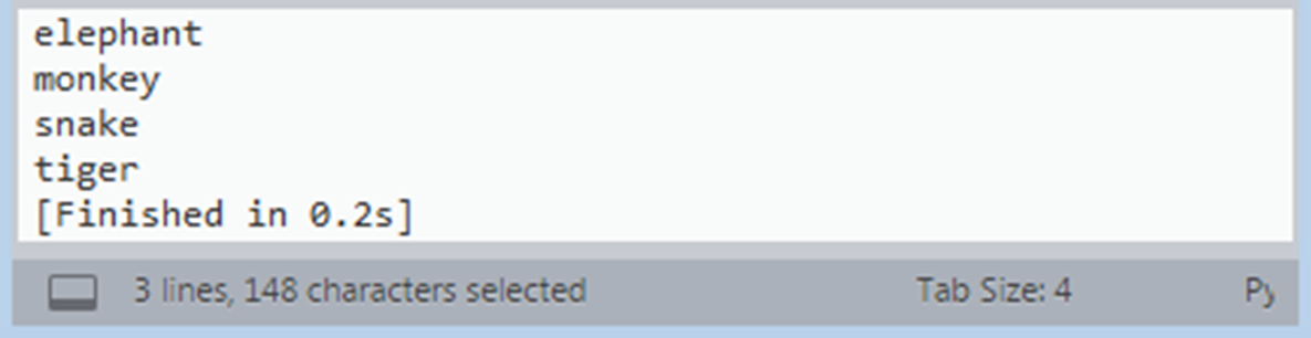 >>>animal = ['elephant', 'monkey', 'snake', 'tiger']