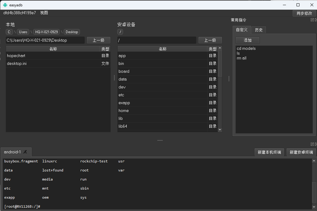 - 左侧:本地文件系统;右侧:Android 设备文件系统(/)