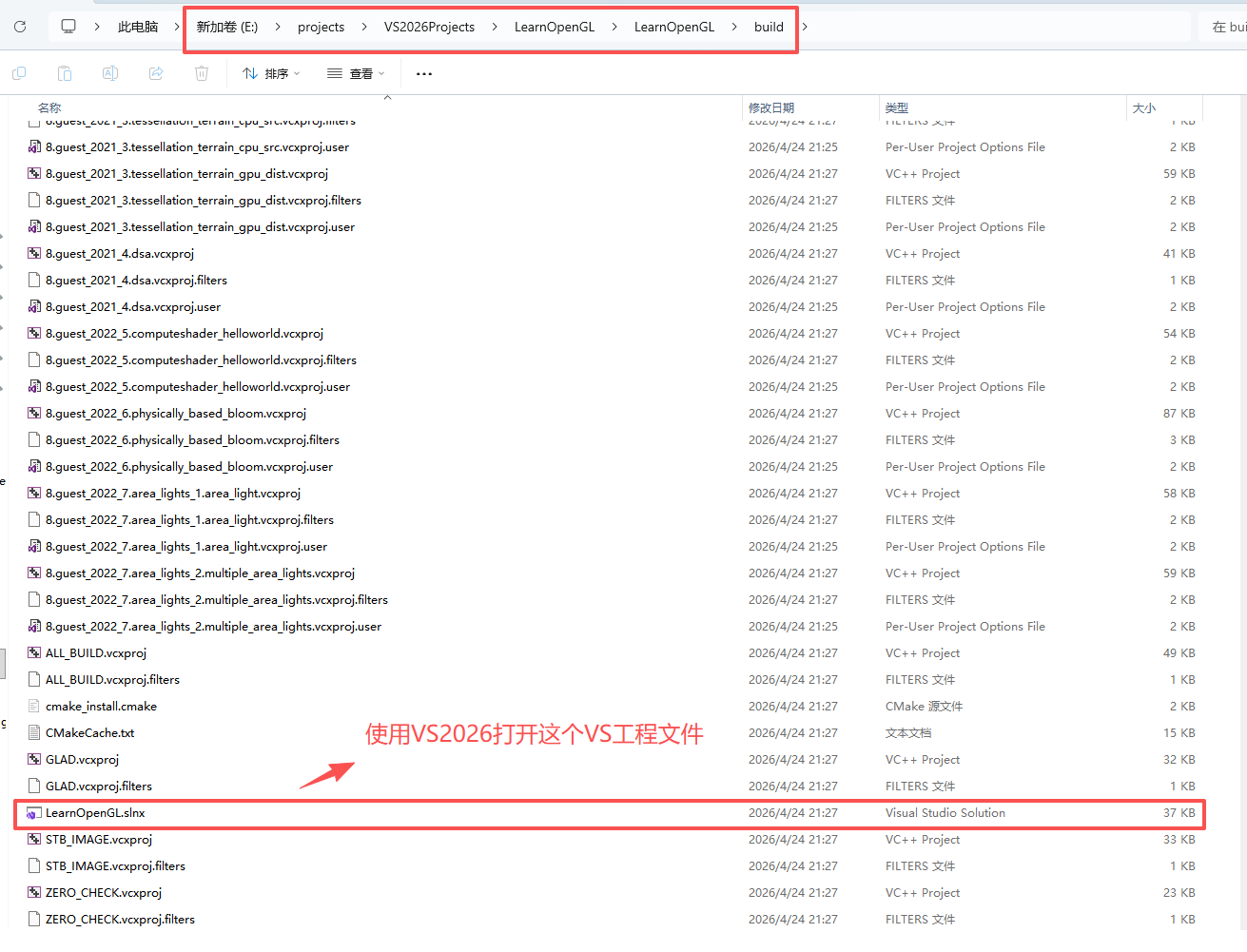然后我们再点击【Generate】按钮,接着在E:\projects\VS2026Projects\LearnOpenGL\LearnOpenGL\build目录下生成了Visual Studio项目工程文件,如下图所示: