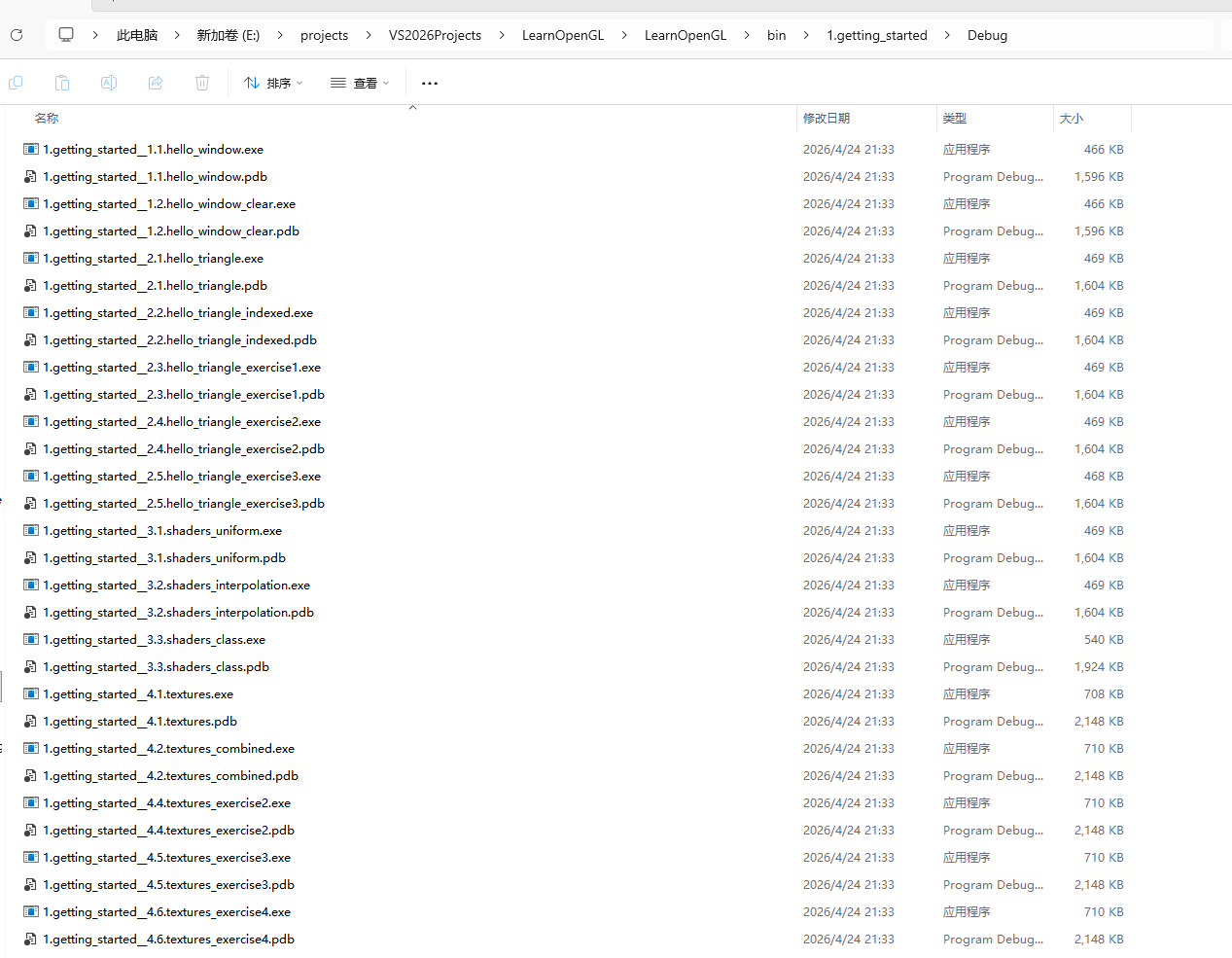 此时在E:\projects\VS2026Projects\LearnOpenGL\LearnOpenGL\bin目录下生成了很多二进制程序,如下图所示: