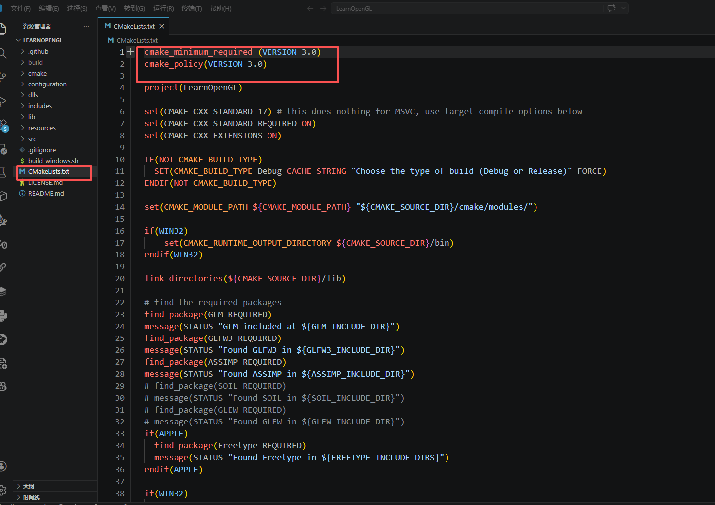 说明CMakeLists.txt里面的CMake版本写得太低了,我们可以修改LearnOpenGL项目源代码中的CMakeLists.txt文件,如下图所示: