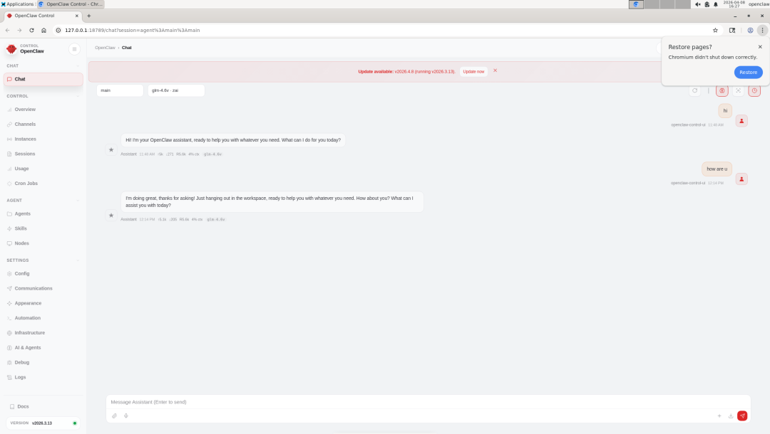 15、访问部署的openclaw,在浏览器输入127.0.0.1:18789后回车即可