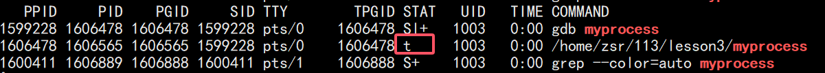 gdb调试并设置断点,程序停在断点处时,状态显示为t(小写)。