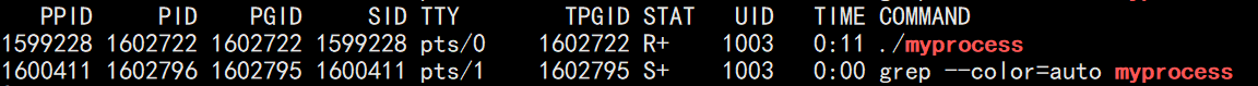 由于printf运行太快了查不到r所以为s状态。s左上角有个加号表示进程在前台运行,./myprocess &放到后台运行