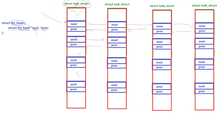 task_struct对象可以同时属于多个不同的链表 (例如全局进程链表、运行队列、等待队列等),只需在结构体中包含多个list_head成员。 -