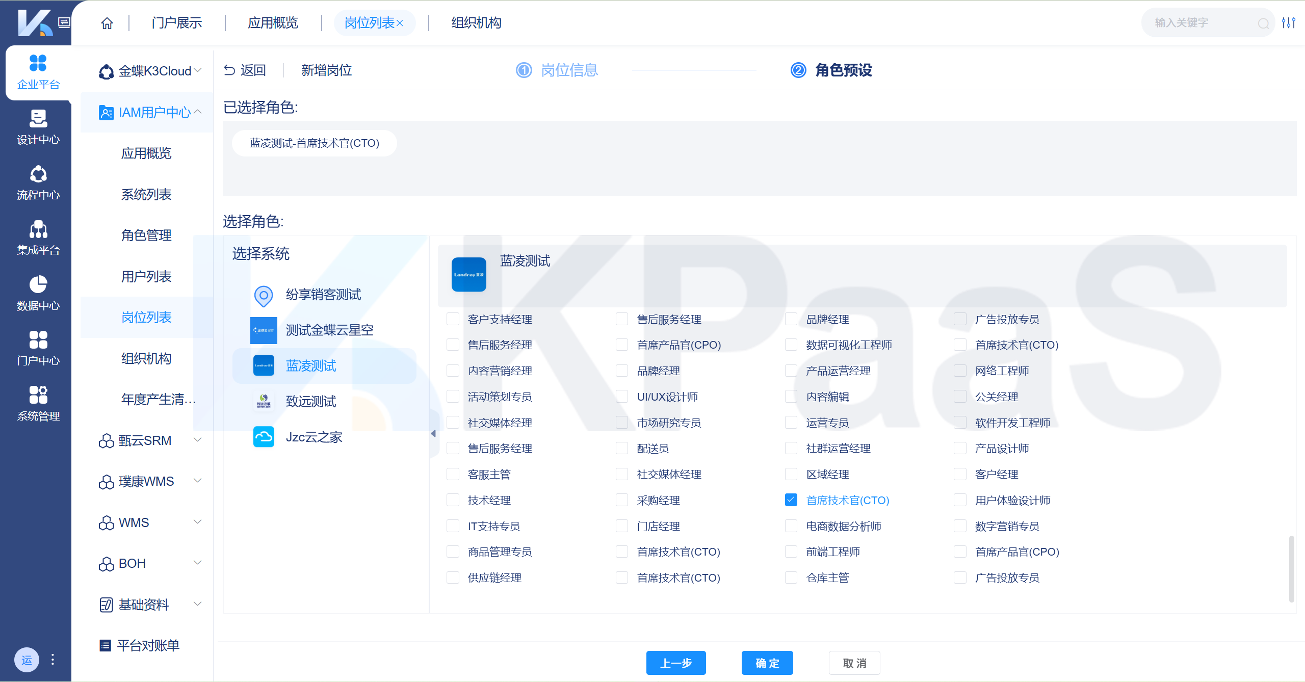 KPaaS平台的各岗位列表中设置不同系统的角色预设