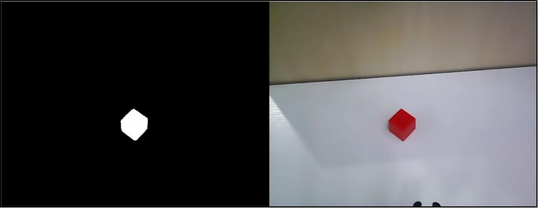 将颜色物体放置在摄像头的视野范围内,拖动 L、A、B 分量滑杆调整阈值,直至画面显示区左侧画面内的颜色物体区域变为白色,其它区域变为黑色。