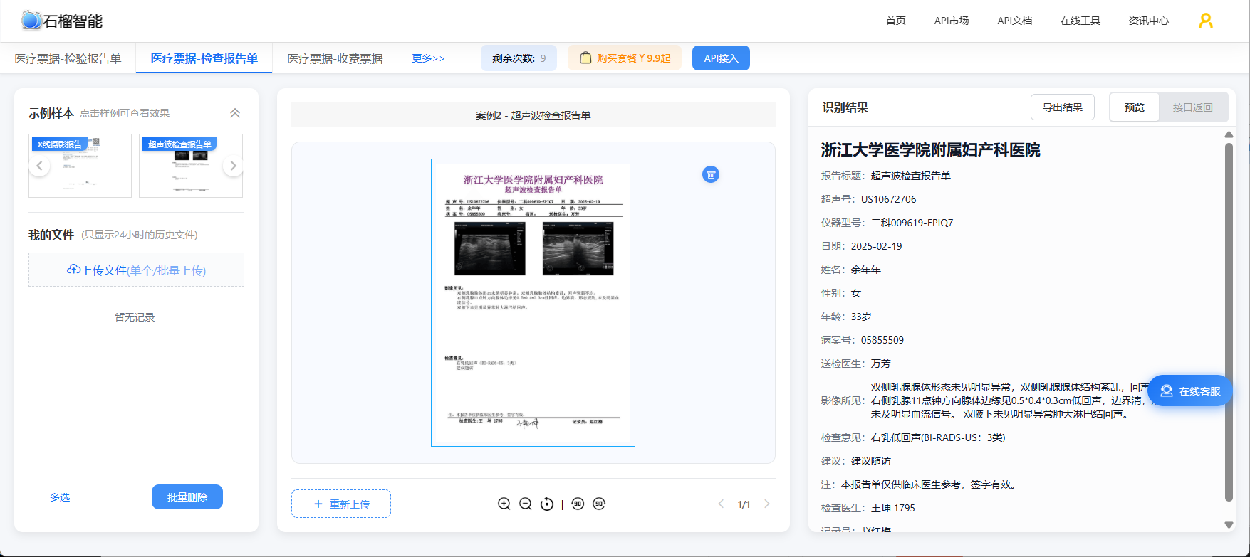 提前 :本节的API接入方法调用自[石榴智能]医疗票据OCR平台。[在线工具体验链接]免费在线体验,访问[API接入教程链接]查阅Web API完整文档,提供多种接入语言示例(如python、js、C#、java、php等),以及自动化脚本语言(如天诺、懒人精灵、按键精灵、易语言、EasyClick、触动精灵等)