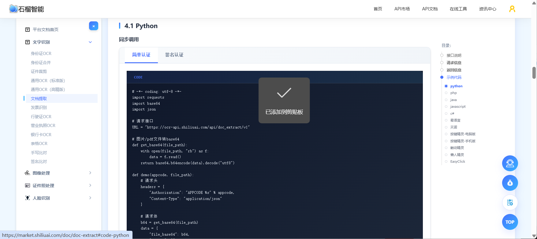 # API文档清晰,提供多种接入语言示例(如python、js、C#、java、php等),以及自动化脚本语言(如天诺、懒人精灵、按键精灵、易语言、EasyClick、触动精灵等)