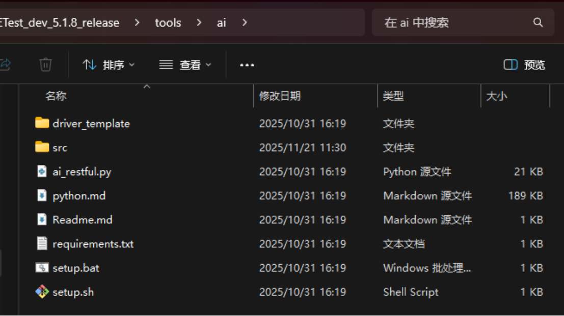 打开ETest根目录,导航至tools\ai目录下,确认目录内容包括服务启动脚本ai_restful.py及相关配置文件,目录结构如下图所示。首次使用时,需要双击setup.bat安装ai_restful.py依赖包。