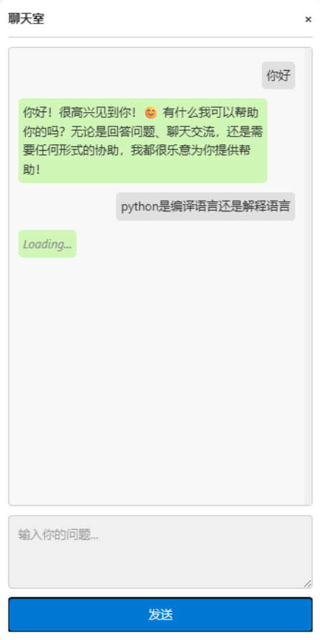 发送后,聊天室界面上出现"loading...",表示AI助手正在分析您的问题,请耐心等待片刻,无需重复点击。