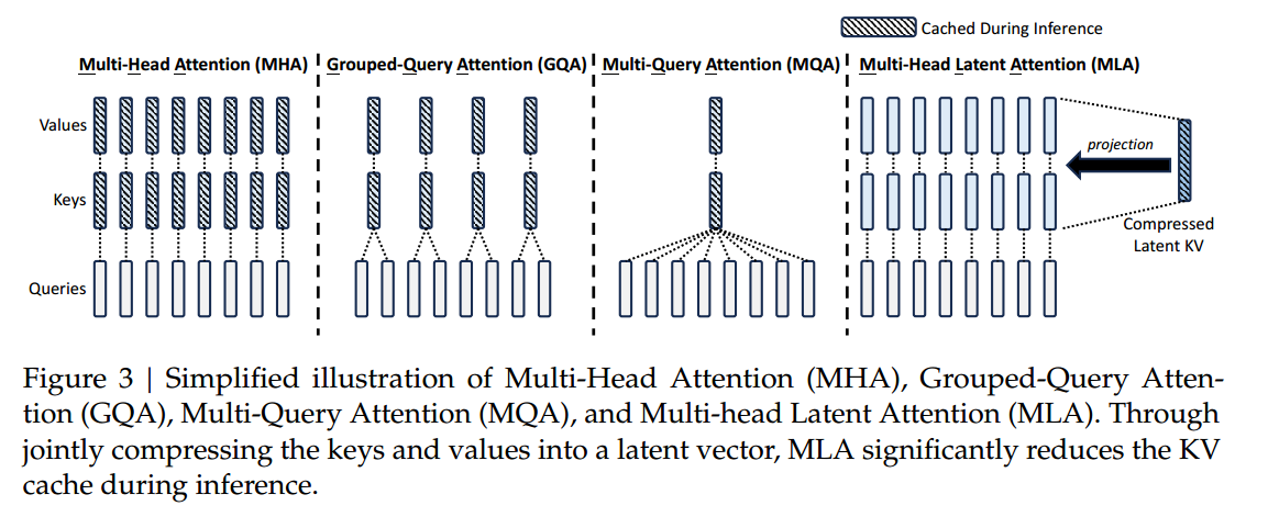 而MLA(Multi-Head Latent Attention,上图4) ,则没有减少 K K K和 V V V的头数,而是在 K K K和 V V V的来源上做文章。具体地,它定义了一个"低秩联合压缩"(low-rank joint compression for keys and values ) C C C。其中 C C C的维度 d c < < d d_c << d dc<<d。原始的MHA,令 K t = W K t X , V t = W V t X K_t=W_{Kt}X,V_t=W_{Vt}X Kt=WKtX,Vt=WVtX,而MLA的思想是计算出 C = W C X C=W_C X C=WCX( d d d维降至 d c d_c dc维),它的K和V来自 K t = W K t C , V t = W V t C K_t=W_{Kt}C,V_t=W_{Vt}C Kt=WKtC,Vt=WVtC( d c d_c dc维到 d / h d/h d/h维),但是------ 它们不需要被显式计算出来。