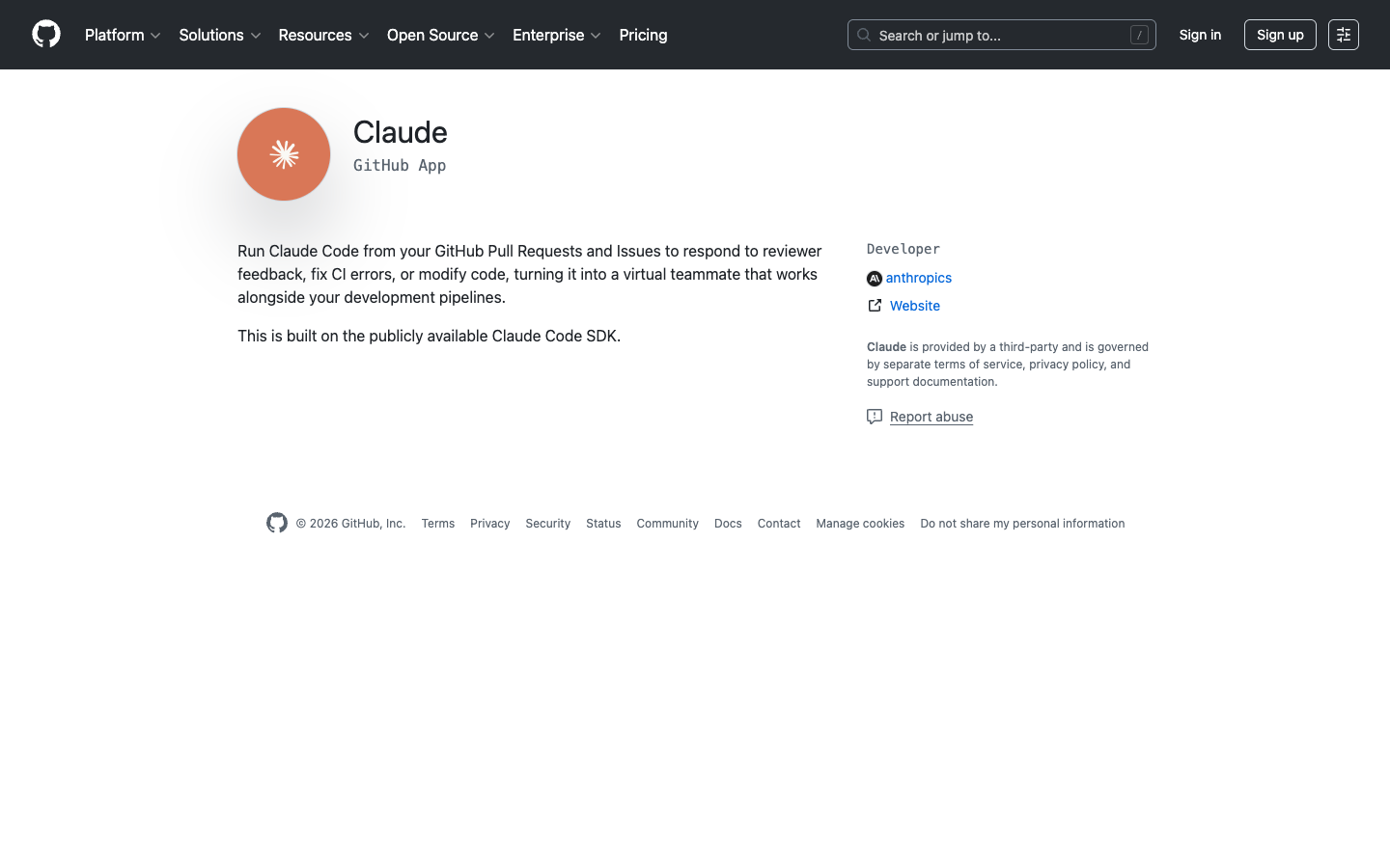 访问 Claude GitHub 应用页面 将 Claude GitHub 应用安装到您的仓库中。