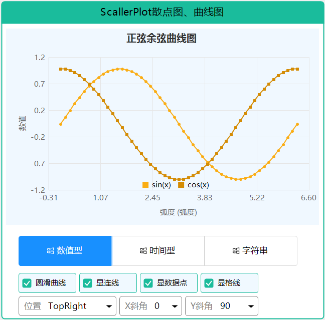 ScatterPlot 是一个功能强大的散点图和折线图控件,参考 ScottPlot 设计,支持平滑曲线、多种X轴类型(数值型、字符串型、日期时间型)、网格线、值提示和图例显示。