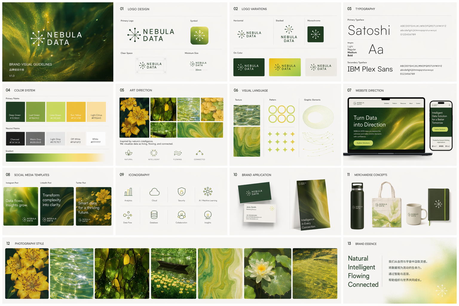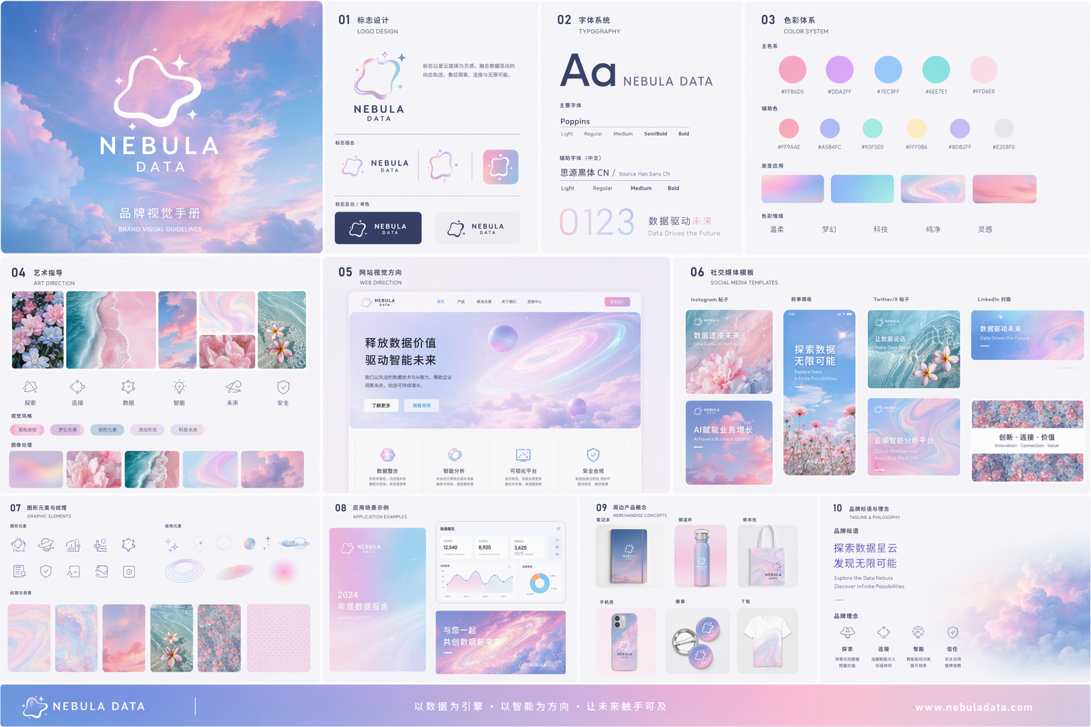基于已上传的情绪板,为一家名为「NEBULA DATA」的公司打造一套精致的多页品牌视觉手册(以多张图呈现)。内容需包含:标志设计、字体系统、色彩体系、艺术指导、网站视觉方向、社交媒体模板以及周边产品概念。最终将其整合生成一张完整图像。