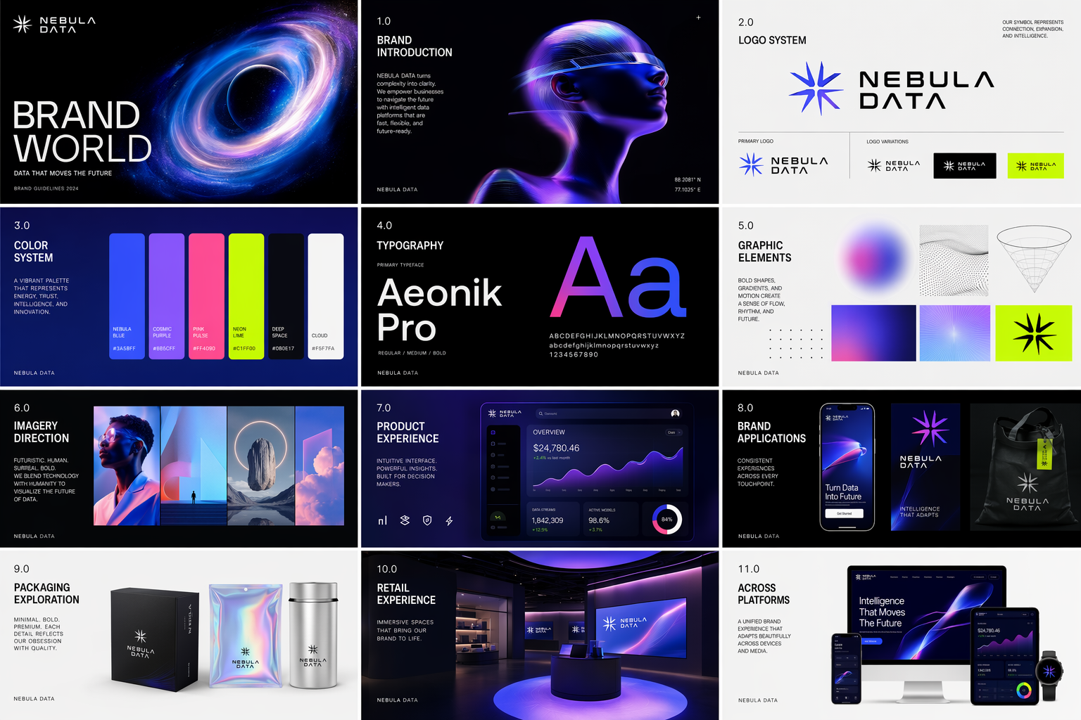 为名为 "NEBULA DATA" 的公司创建一份精心制作的多页(多张图片)品牌资料包。该品牌应具有简洁、未来感、充满活力和设计前卫的特点,将UI移动端或者Web端高级与稳重相融合。采用大胆、实验性的视觉形象,运用明亮色彩、简洁几何形状、现代字体、动态运动元素和略带超现实的图像。整体氛围应感觉富有创意、充满活力、有节奏感、触感丰富且概念性强,同时兼具有趣的消费产品文化、类似时尚的展示方式和当代数字设计的元素。包含对产品痴迷的感觉、视觉实验、包装探索、编辑摄影、沉浸式零售以及跨平台的品牌应用。使其感觉像一个自信、现代的品牌世界,既易于理解又具有艺术指导性,具有强大的图形凝聚力和高端创意工作室的美学风格。