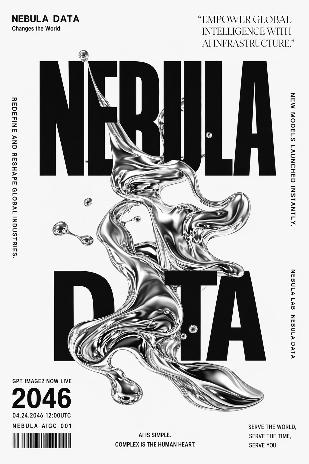 一个高度精细的极简未来主义海报设计,整体采用干净的黑白配色,并辅以铬质液态金属点缀。画面中心是一件大型、超写实、具有高光泽感的金属流体雕塑,其形态类似流动的水银或熔融的铬金属,以有机的方式扭曲、盘旋,并穿插于粗体无衬线字体"NEBULA DATA"之中(排版拆分为上方"NEBULA",下方"DATA")。整体版式为一本虚构品牌的非对称杂志封面风格,品牌名称为:"NEBULA DATA Changes the World"请在画面中精确放置以下文本元素,并严格对应位置:.左上角:"NEBULA DATA""Changes the World"右上角(使用优雅的衬线字体呈现引用语):"EMPOWER GLOBAL INTELLIGENCE WITH AI INFRASTRUCTURE."左侧竖排文字:"REDEFINE AND RESHAPE GLOBAL INDUSTRIES."右侧竖排文字:"NEW MODELS LAUNCHED INSTANTLY.""NEBULA LAB NEBULA DATA"左下角:"GPT IMAGE2 NOW LIVE"大号数字:"2046"04.24.2046 12:00UTC"条形码编号:"NEBULA-AIGC-001"底部中间:"AI IS SIMPLE. COMPLEX IS THE HUMAN HEART."右下角:"SERVE THE WORLD, SERVE THE TIME, SERVE YOU."整体视觉要求:极致干净、强对比、高端印刷级质感;排版精准且具有高级编辑设计感;细微且克制的投影处理;金属流体表面具备锐利反射与真实高光表现;电影级光影氛围;8K分辨率;整体呈现为高端杂志级视觉输出;风格为科幻极简主义(sci-fminimalism)。