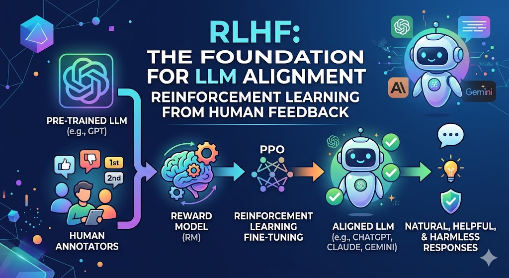 Reinforcement Learning from Human Feedback,即"基于人类反馈的强化学习",是当代大语言模型对齐(Alignment)技术的基石。ChatGPT、Claude、Gemini 等主流模型之所以能够以自然、有帮助、无害的方式与人类对话,背后的关键技术正是 RLHF。
