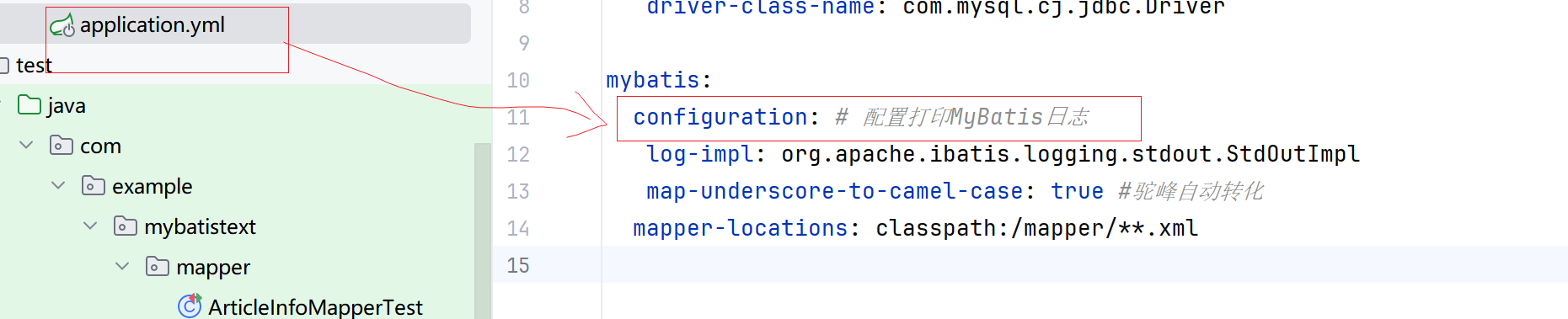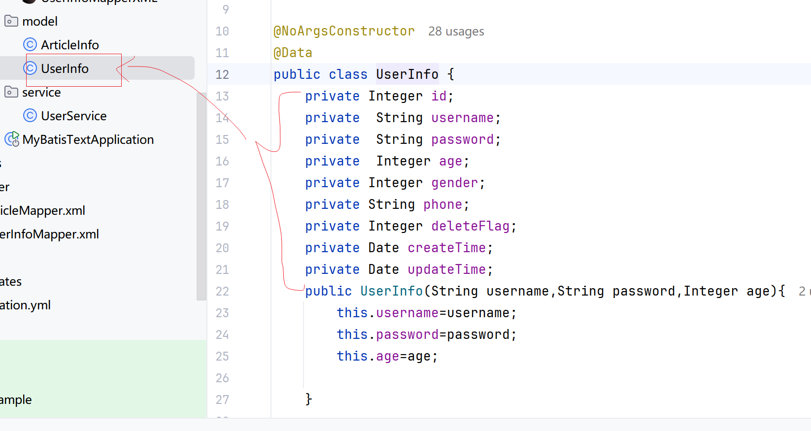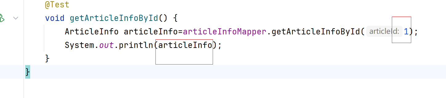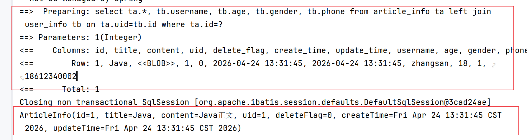 而下面那个红框框呢,是我们测试的打印articleInfo对象实体的tostrinhg方法,而我们细心观察到,我们对应的实体类的属性全都映射上了,这也是因为我们在yml文件里配置了驼峰自动转化,这个不多讲,但是根据我们学习数据库的左连接知识,也根据上上图的打印信息来看,明显两张表的字段没有,也不能直接有位置映射到只含部分属性的articleInfo实体类上,所以我们在ArticleInfo类上再添加几个属性,