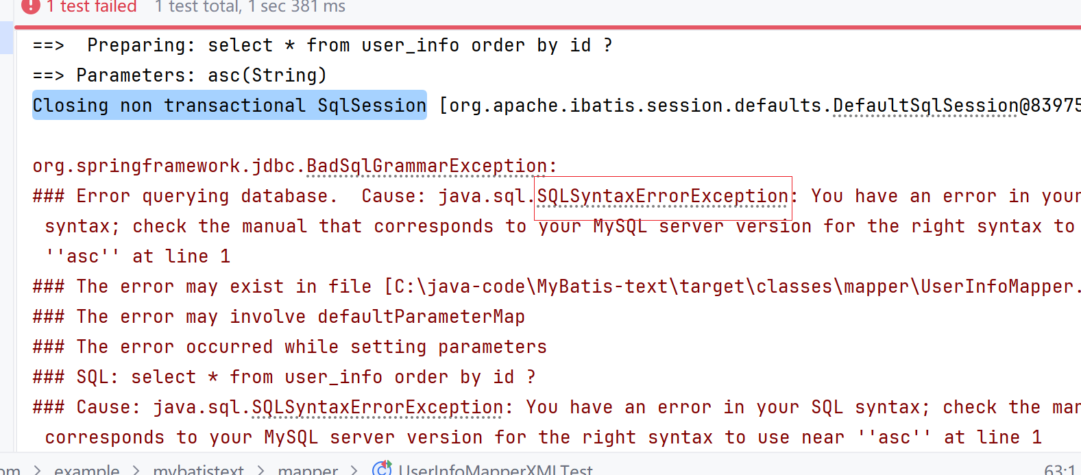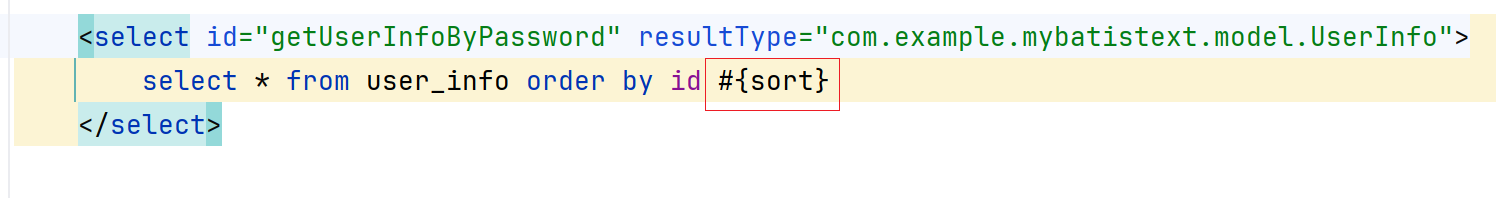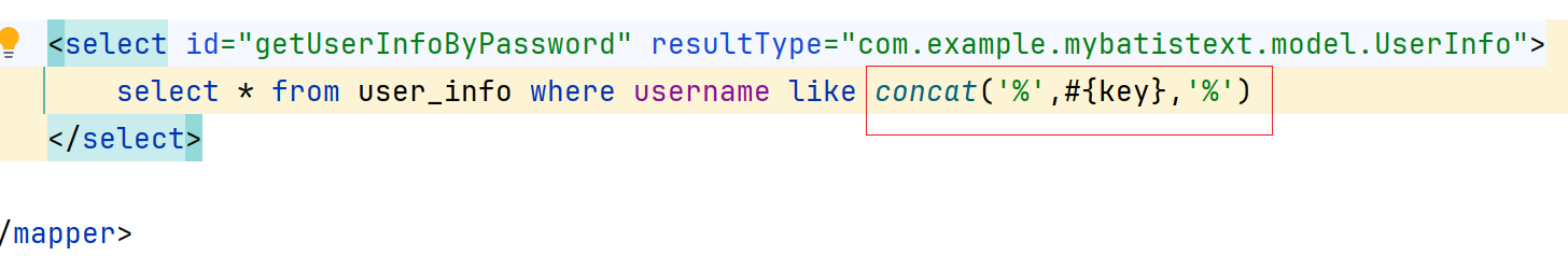 在xml文件里,将${ }给包裹一个单引号,由于它时直接拼接吧,那我们就在它直接拼接之前,在两侧加上单引号,然后它直接拼接到单引号里面去,就不会产生错误的sql语句了