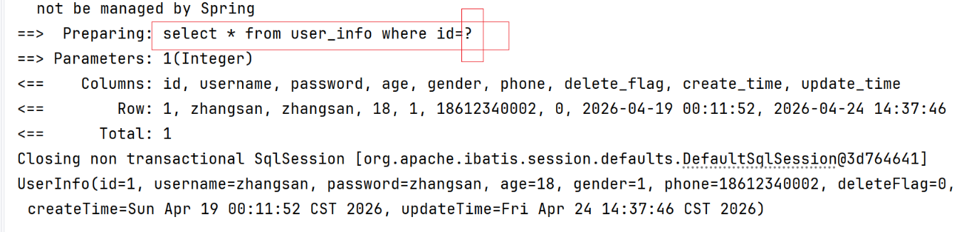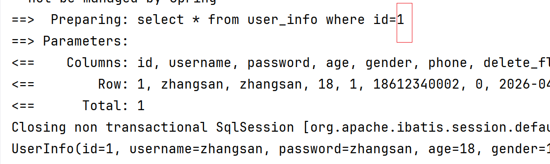 这个打印结果呢,大家要看清楚了,上面的那个呢,是我们在yml文件里面配置的一个mybatis打印日志,如下