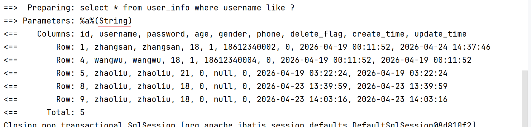 就大家有想到为啥我要这样写吗,#{ }会自动加单引号,而我们的like语句有必须要有单引号,两者一拍即合,所以这就是#{ }的完美应用场景。