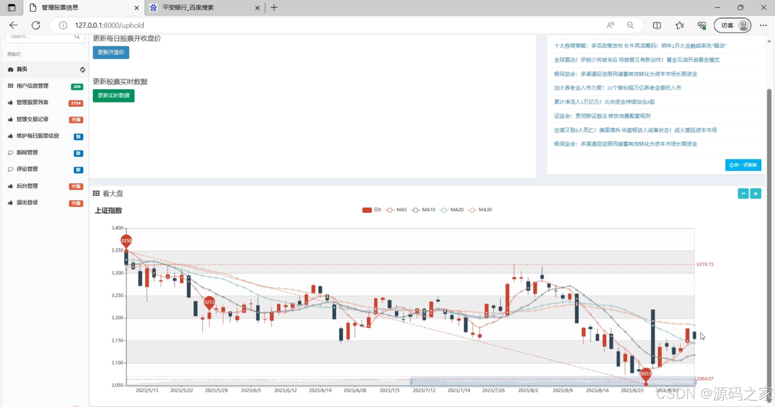 该页面聚焦于大盘走势分析,提供更新每日开盘价和实时数据的功能按钮,方便管理员手动同步最新行情。主区域以上证指数K线图呈现股价波动趋势,右侧辅以相关市场新闻列表,便于用户在分析技术图形的同时获取基本面信息。