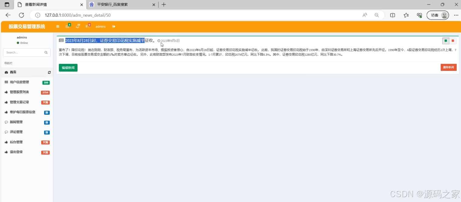 该页面是股票交易管理系统的新闻详情页,用于展示单条新闻的完整内容,提供编辑和删除新闻的操作按钮,方便管理员对新闻资讯进行修改和维护。