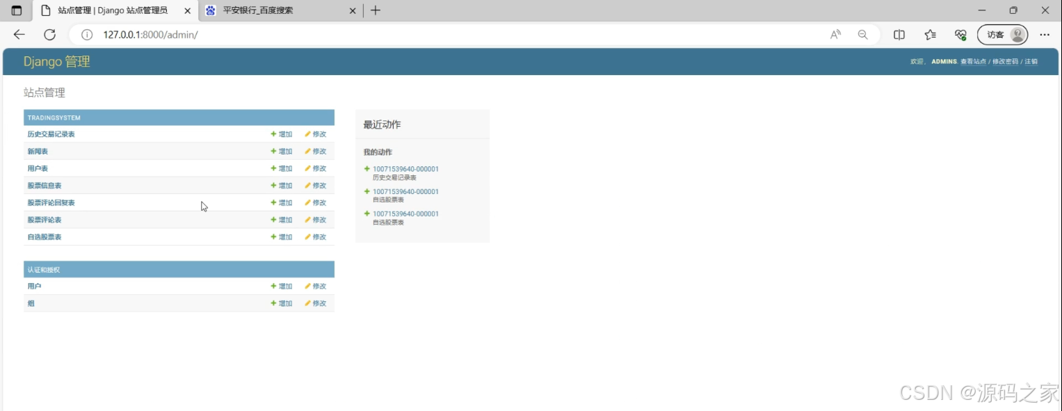 该页面是基于Django框架的站点管理后台,可对系统内各类数据表和用户权限进行增加与修改操作,同时显示管理员的最近操作记录,方便进行全量数据和权限的统一管理。