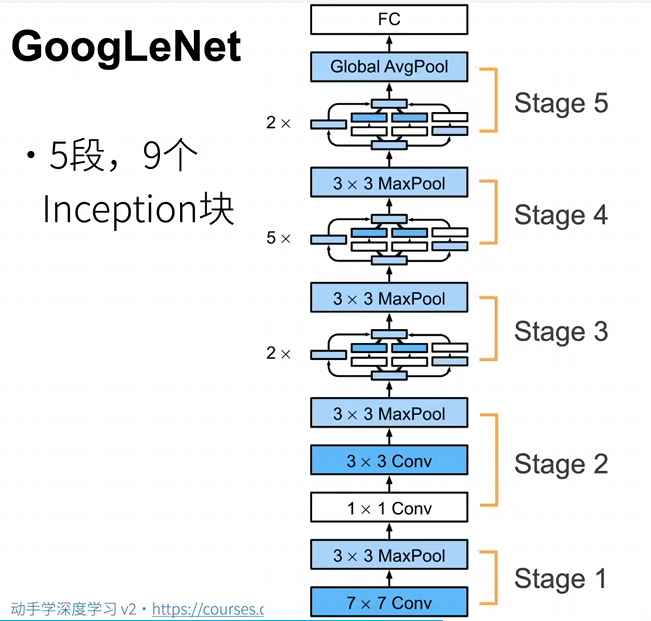 GoogleNet使用了9个Inception块,是第一个达到上百层的网络,后续有一系列改进。(V3、V4还是被持续使用,问题是结构很复杂 )