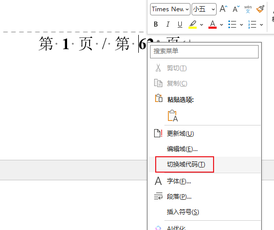 - 切换域代码:选中总页数,右键选择"切换域代码"(或者快捷键Shift+F9,Alt+F9是将所有结果切换为域代码)。
