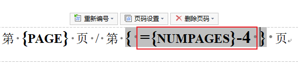 - 输入公式:定位光标位置插入花括号(快捷键Ctrl+F9),前输入"=",在花括号后输入"-1"或"-2"(根据需要减去的页数)将"NUMPAGES"剪切粘贴到花括号中。