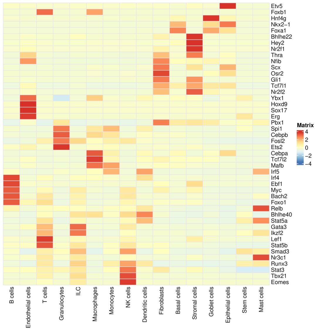 SCENIC通过对单细胞转录组数据进行顺式调控网络分析,识别活跃的转录因子及其调控的靶基因集合,从而推断每个细胞的调控状态,并辅助解释细胞类型或状态的生物学特性。首先转录因子活性特异性评分可以告诉我们哪些转录因子及其靶基因具有显著的特异性活性(图8),例如在巨噬细胞中Mafb的regulon特异性评分(RSS)很高,说明该转录因子的调控活性在该细胞类型中具有高度特异性,其靶基因集整体被显著激活。转录因子表达量热图(图9),可比较不同实验处理下同一细胞类型的转录因子活性变化,直观看出处理对细胞调控状态的影响。另外筛选出的转录因子可以作为关键候选,用于指导下游的湿实验,可设计体外或体内实验来验证TF的功能。