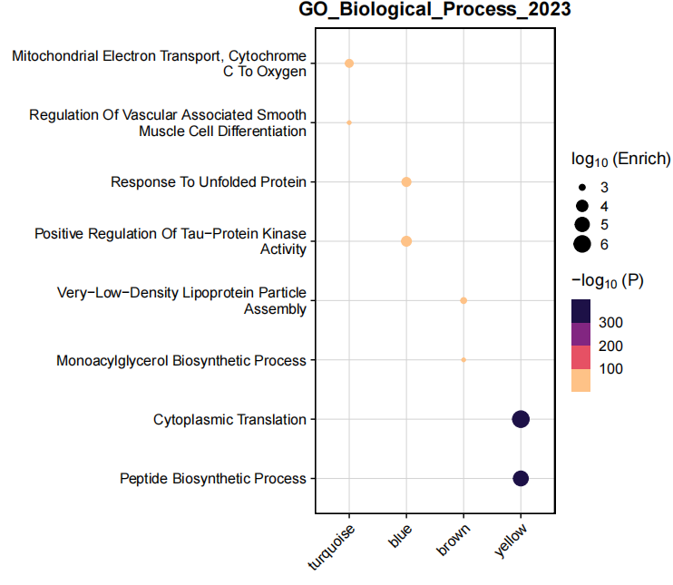 传统差异方法得到的差异基因数量众多,当面对成百上千的差异基因列表不知如何选择,这些基因之间有何内在联系也不清楚。 hdWGCNA分析专为单细胞数据设计,能够识别共表达基因模块(图4),将成千上万个基因归类为多个内部表达高度协同的几个功能模块。模块活动雷达图(图5)可以清晰展示不同实验条件下,哪些模块被整体激活或抑制,指向核心功能通路。一个模块内的基因往往在功能或调控上存在关联,可能受到共同的上游转录因子调控,或参与相同的生物学过程,该分析也可以预测驱动整个模块协同表达的潜在转录因子(图6)。最终进行功能富集分析,对功能聚焦的模块进行富集分析(图7),结果更精确的指向具体的生物学过程。该分析可作为深入探究某一关键细胞类型内部,响应外界刺激或自身状态变化的核心功能程序与调控枢纽。