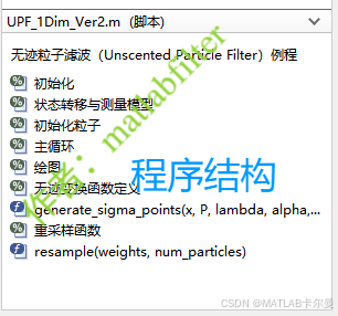 本程序实现了一个基于**无迹粒子滤波(Unscented Particle Filter, UPF)**的一维目标状态估计示例,用于对直线运动目标的位置进行滤波与精度分析。系统以一维匀速运动为背景,传感器提供带噪位置观测,滤波器利用无迹变换与粒子采样相结合的方式,对目标状态进行递推估计,并与原始观测结果进行对比。