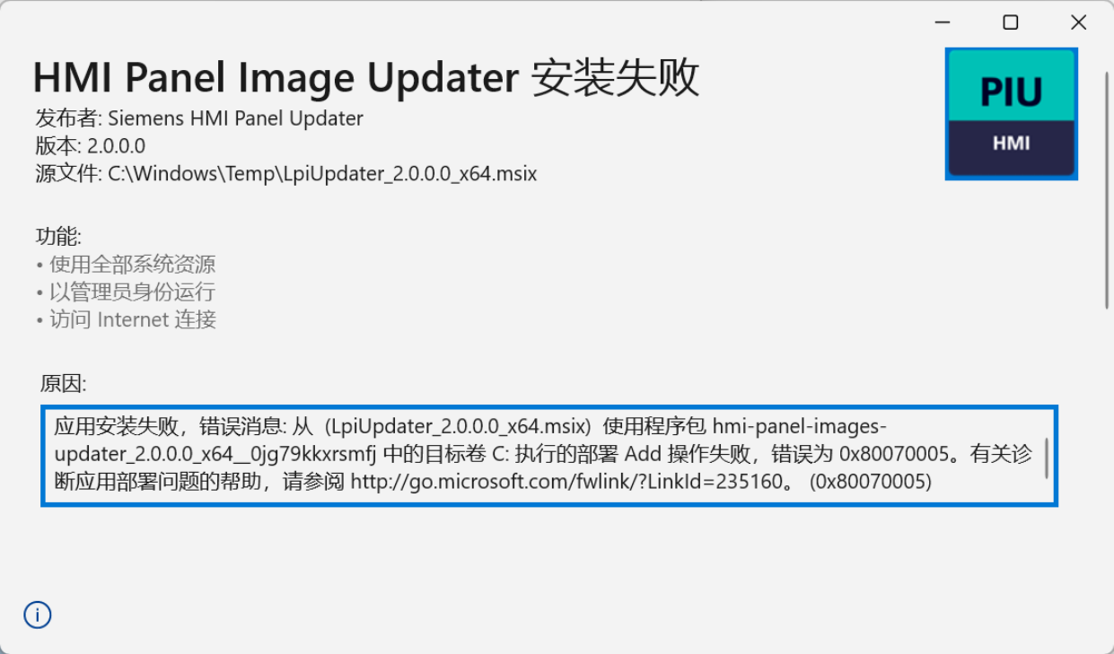 应用安装失败,错误消息: 从 (LpiUpdater_2.0.0.0_x64.msix) 使用程序包 hmi-panel-images-updater_2.0.0.0_x64__0jg79kkxrsmfj 中的目标卷 C: 执行的部署 Add 操作失败,错误为 0x80070005。有关诊断应用部署问题的帮助,请参阅 http://go.microsoft.com/fwlink/?LinkId=235160。 (0x80070005)