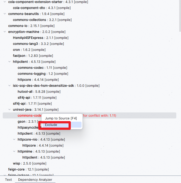 下面举个例子,如果jar包冲突了,它是会爆红的,如果你放在那不管,有可能没有问题,但是有些时候会产生冲突(版本不一样导致方法或属性的变更),可以使用下面的方式,点exclude快速排除依赖。
