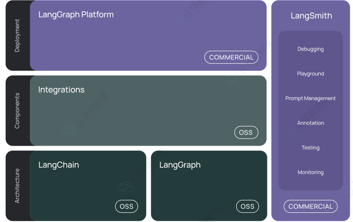 对于上述技术内容,LangChain 的开源组件和第三方集成可以轻松支持快速上手,帮助我们构建应用 程序。除此之外,使用 LangGraph 可以构建支持人机交互的有状态代理。LangChain 公司也在围绕框 架构建完整的生态系统,包括推出 LangSmith(一个用于调试、监控和评估 LLM 应用的平台)以及 LangGraph Platform(用于 LangChain 应用的部署、运维)等,为开发者提供从开发到生产的一站式 支持。