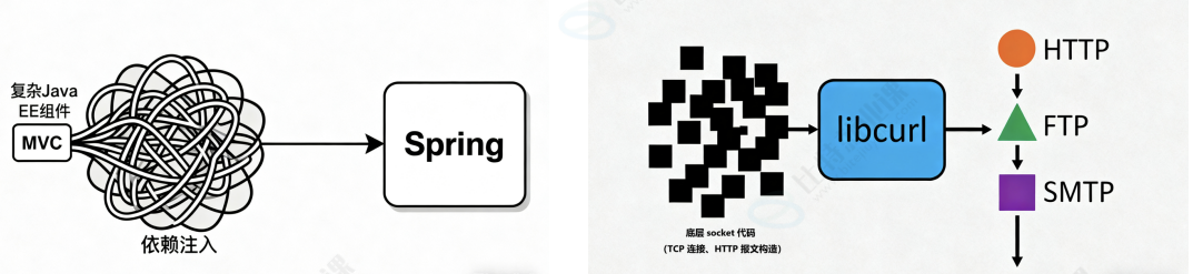 AI 开发框架与传统框架(如 JAVA 中的 Spring,C++ 中的 libcurl 库),它们都共享一些框架原则: 抽象与封装 Spring:封装了Java EE开发的复杂性,如依赖注入、事务管理、MVC。开发者不需要手动管理对象生 命周期或处理繁琐的Servlet API。