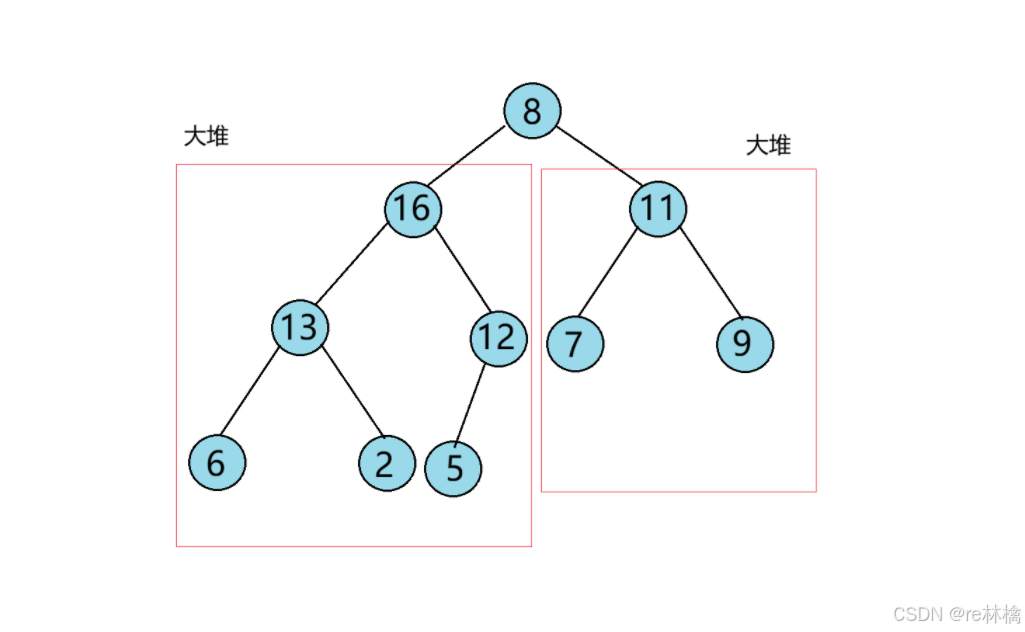 1、如图左右子树均为大堆,根节点不符合大堆的规则。首先从根节点开始,先选择左右子节点中较大的与父节点进行比较,若没有右子节点,直接让左子节点与节点进行比较;