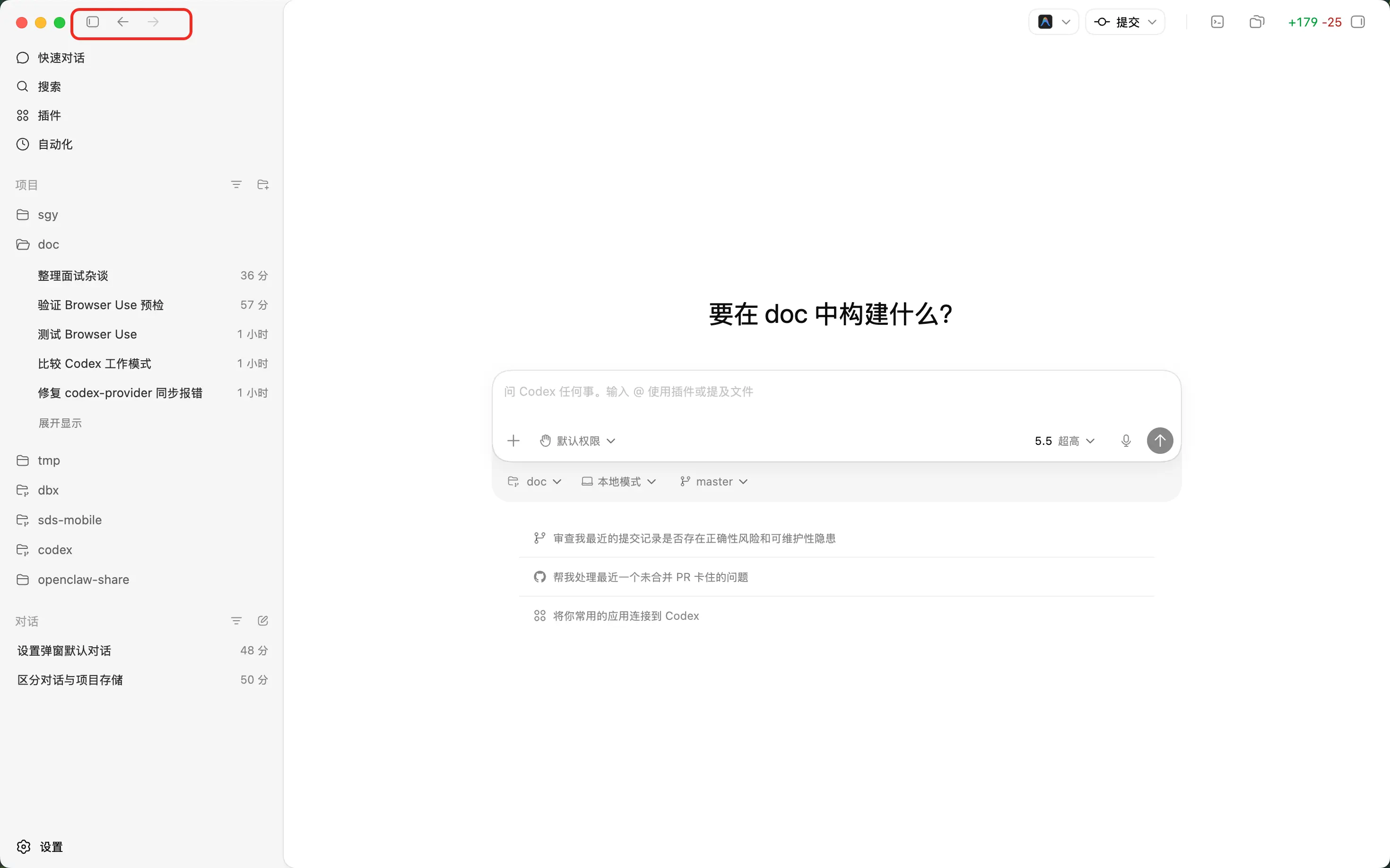 登录成功后,会进入 Codex 主页面。先看左上角区域。