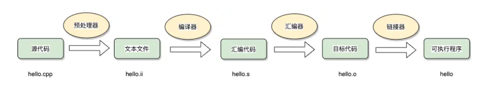 C++的编译过程经过了预处理、编译、汇编和链接四个主要阶段: