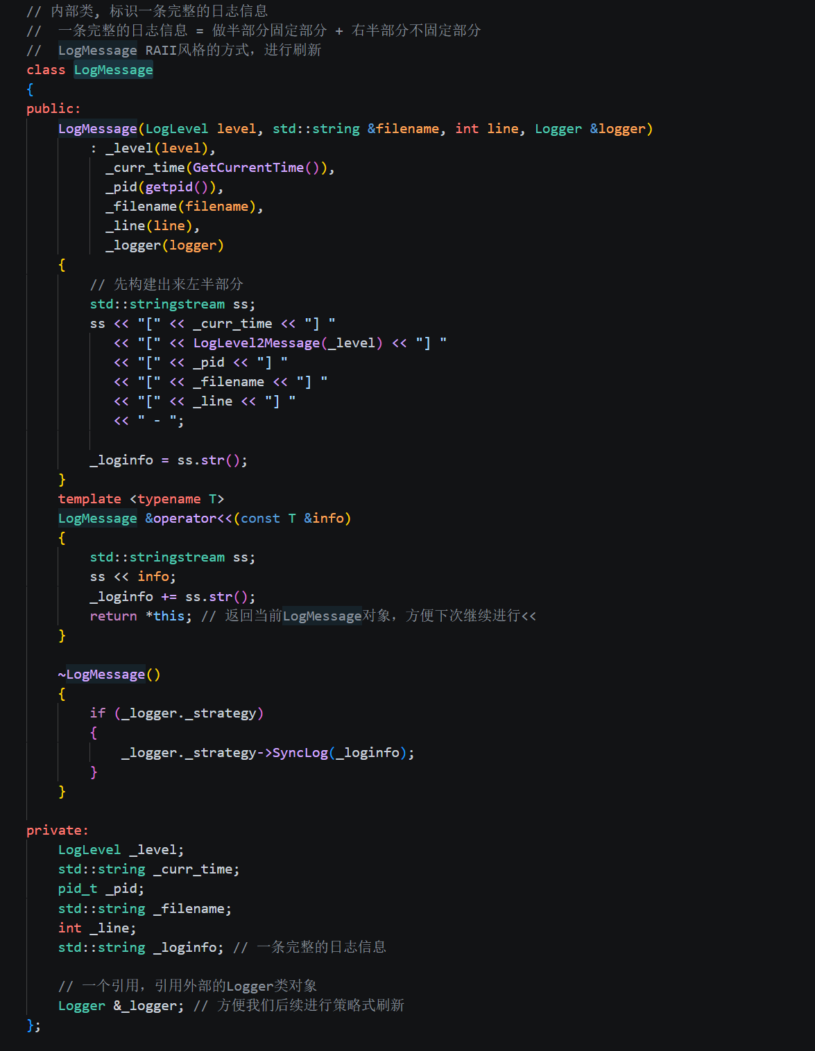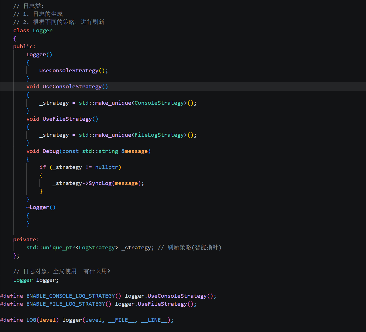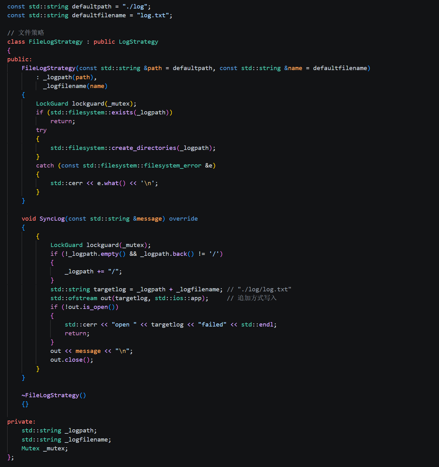第一行的 virtual ~LogStrategy() = default 保证子类正确析构。因为后面会有子类继承这个类,如果用基类指针删除子类对象,析构函数必须是 virtual。= default 表示编译器自动生成默认析构。