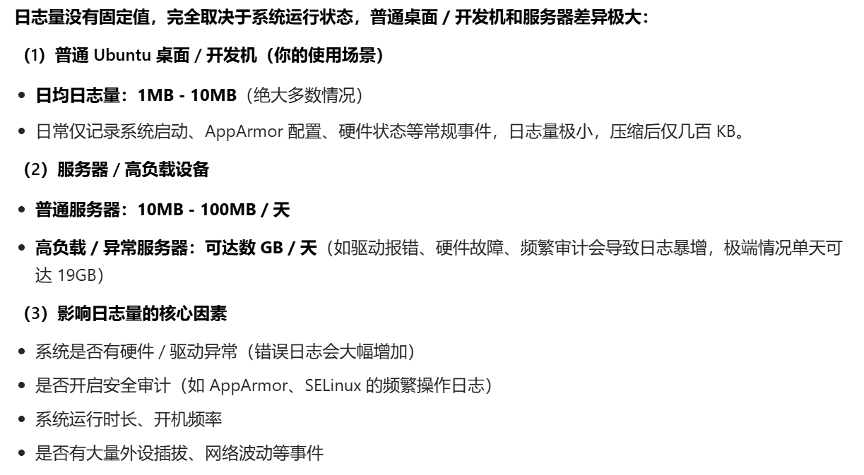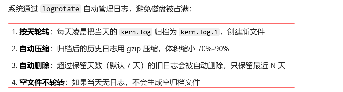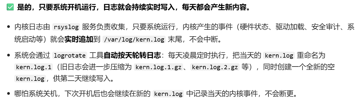 /var/log/kern.log 是 Ubunt 专属的内核日志文件,专门记录内核(Kernel)运行时产生的所有事件,是排查硬件故障、驱动问题、系统崩溃、内核级异常的核心依据。我们执行的命令 sudo cat /var/log/kern.log 就是直接查看该文件的完整内容。