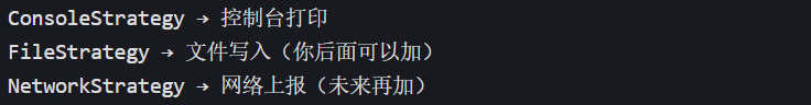 就会出现多种不同的输出方式,策略模式就是为了让我们在换日志输出方式时,不用改其他业务代码。就像耳机接口 → 插耳机是一个策略 → 插音箱是另一个策略 → 而不需要重新改造你的手机。